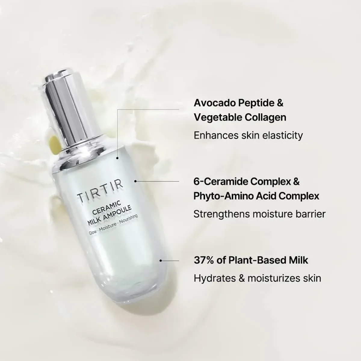 The TIRTIR Ceramic Milk Ampoule is an amazing K-beauty essential, blending a vegan 37% Vegan Milk Complex—soybean, coconut, almond, oat, and rice extracts—with a 6-ceramide complex, squalane, and rice bran...