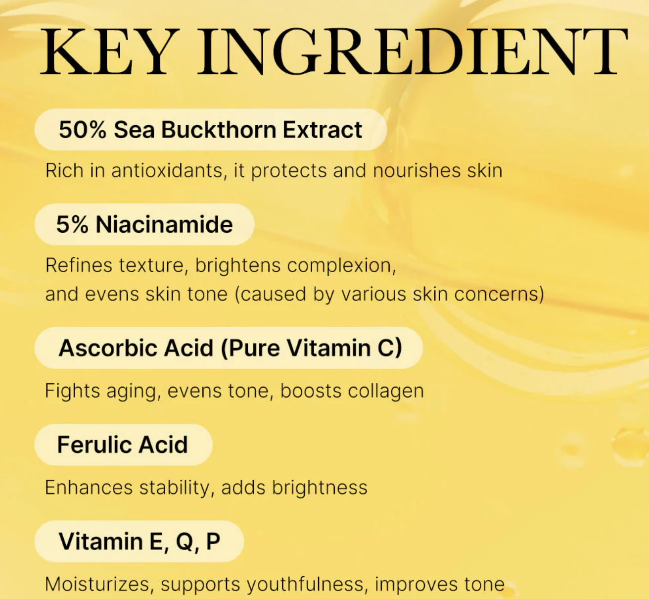 The Vitamin Capsule contains Sea Buckthorn Extract at an impressive 50% concentration, along with 5% Niacinamide and Pure Vitamin C, encapsulated to maintain freshness and potency with each use. Say goodbye to oxidizing issues common in Vitamin skincare, as our exclusive technology ensures efficient delivery for maximum effectiveness.